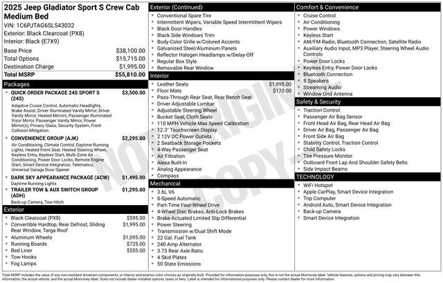 Discover the exceptional 2025 Jeep Gladiator Sport S, a rugged and capable off-road companion that's ready to conquer any adventure. With its powerful 3.6L V6 engine, 8-speed automatic transmission, and legendary 4WD system, this Gladiator delivers impressive performance and uncompromising capability.