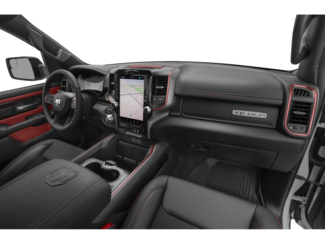Leather, Automatic temperature control, Convex Wide-Angle Exterior Mirror Insert, Dual Wireless Charging Pad, Dual-Pane Panoramic Sunroof, Front Bucket Seats, Front dual zone A/C, GPS Navigation, Harman/Kardon 19 Speaker Premium Sound, Heated door mirrors, Heated Front Seats, Heated Steering Wheel, Illuminated entry, Mopar Black Tubular Side Steps, Navigation System, Power Adjustable Pedals with Memory, Power door mirrors, Power Tailgate, Proximity Approach/Departure Lamps, Rain Sensitive Windshield Wipers, Rebel Level 2 Equipment Group.