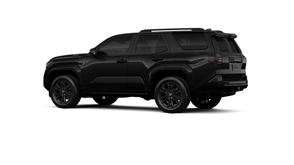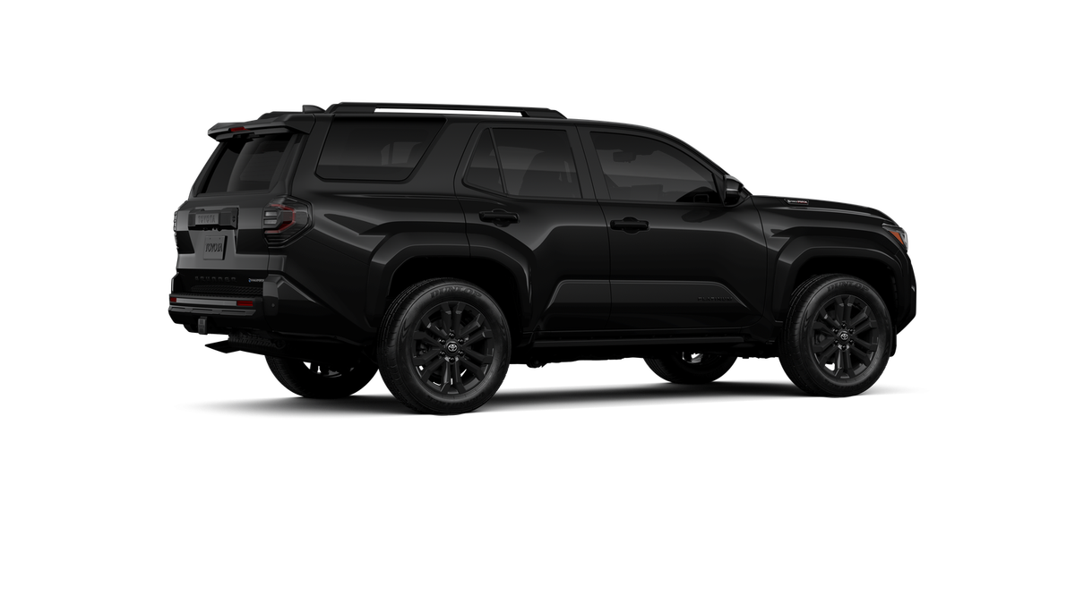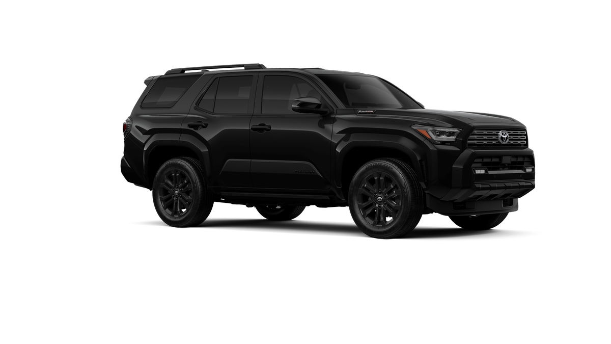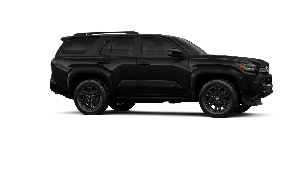 - Dark-chrome tri-bar grille; gloss-black mirror caps and door handles; color-keyed overfenders and rear spoiler; gloss-black "PLATINUM" and "4RUNNER" badges